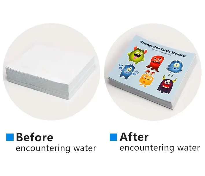 தண்ணீரில் மூழ்கினால், அது உடனடியாக ஒரு பேஸ்ட் போன்ற மாநிலமாக மாறி விரைவாக சிதறுகிறது. அதன் மீது அச்சிடப்பட்ட வண்ணங்கள் அதற்கேற்ப விரிந்து சிதைந்துவிடும். நிறத்தை மாற்றும் செயல்முறை மீள முடியாதது. தண்ணீரில் ஒருமுறை வெளிப்பட்டால், அது நிரந்தரமாக நிறத்தைக் காண்பிக்கும்.