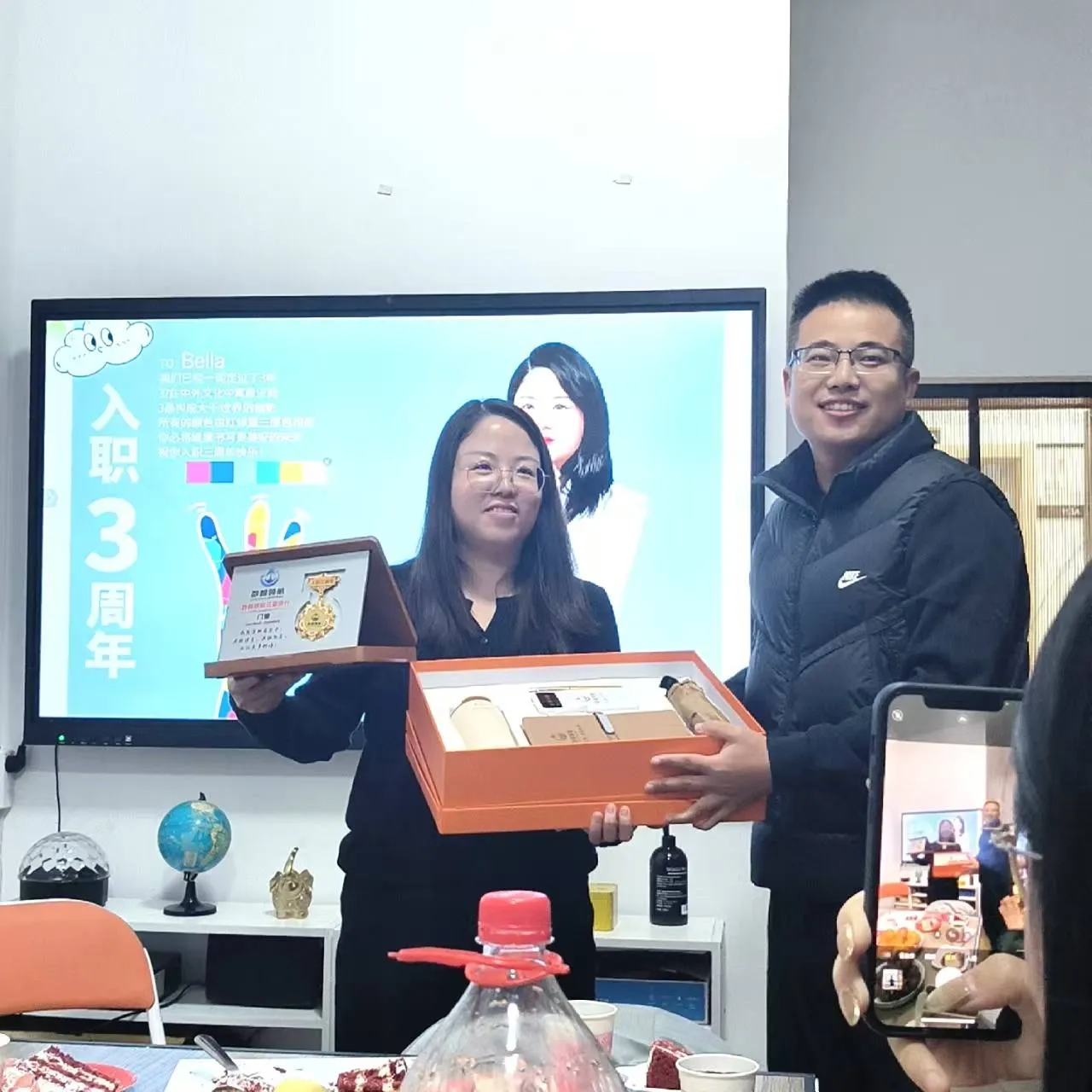 ஒரு அற்புதமான ஆச்சரியமாக, டாம் மற்றும் எல்லா மற்றும் மேலாளர் பெல்லா ஆகியோருக்கு Boss Gao தனிப்பட்ட முறையில் அழகான பணி ஆண்டுவிழா பரிசுகளை வழங்கினார். இந்த சிறப்பு டோக்கன்கள் கடந்த ஆண்டுகளில் அவர்களின் பங்களிப்புகளுக்கு நேர்மையான அங்கீகாரம் மற்றும் நிறுவனத்துடன் அவர்களின் தொடர்ச்சியான வளர்ச்சிக்கு எங்கள் வாழ்த்துக்களைத் தெரிவிக்கின்றன.