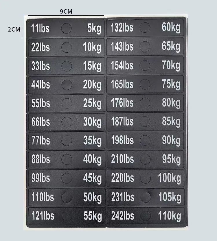 பிரீமியம்-தரமான பொருட்களிலிருந்து வடிவமைக்கப்பட்ட இந்த ஸ்டிக்கர்கள் தினசரி பயன்பாட்டிலிருந்து தேய்மானம் மற்றும் கிழிக்க எதிர்ப்புத் திறன் கொண்டவை. உடற்பயிற்சி உபகரணங்களின் சேவை வாழ்க்கை முழுவதும் அச்சிடப்பட்ட உரை கூர்மையாகவும் மங்கலாகவும் இருக்கும், இது நீண்ட கால செயல்திறனை உறுதி செய்கிறது. தெளிவான எடைக் குறிகளுடன், பயனர்கள் தங்கள் உடற்பயிற்சி முன்னேற்றத்தை சிறப்பாகக் கண்காணிக்கலாம் மற்றும் பயிற்சி இலக்குகளை அமைக்கலாம், அறிவியல் பயிற்சி நிர்வாகத்தை அடையலாம்.